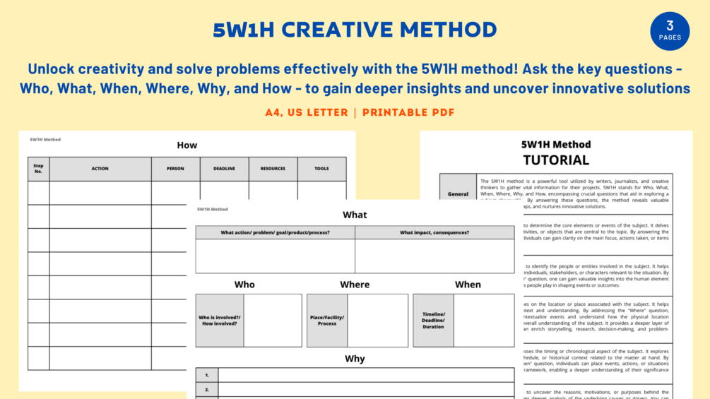 Printable templates will serve as your creative drafts, helping you discover new ideas, explore the world, and tackle any challenges using the 5W1H creative method.