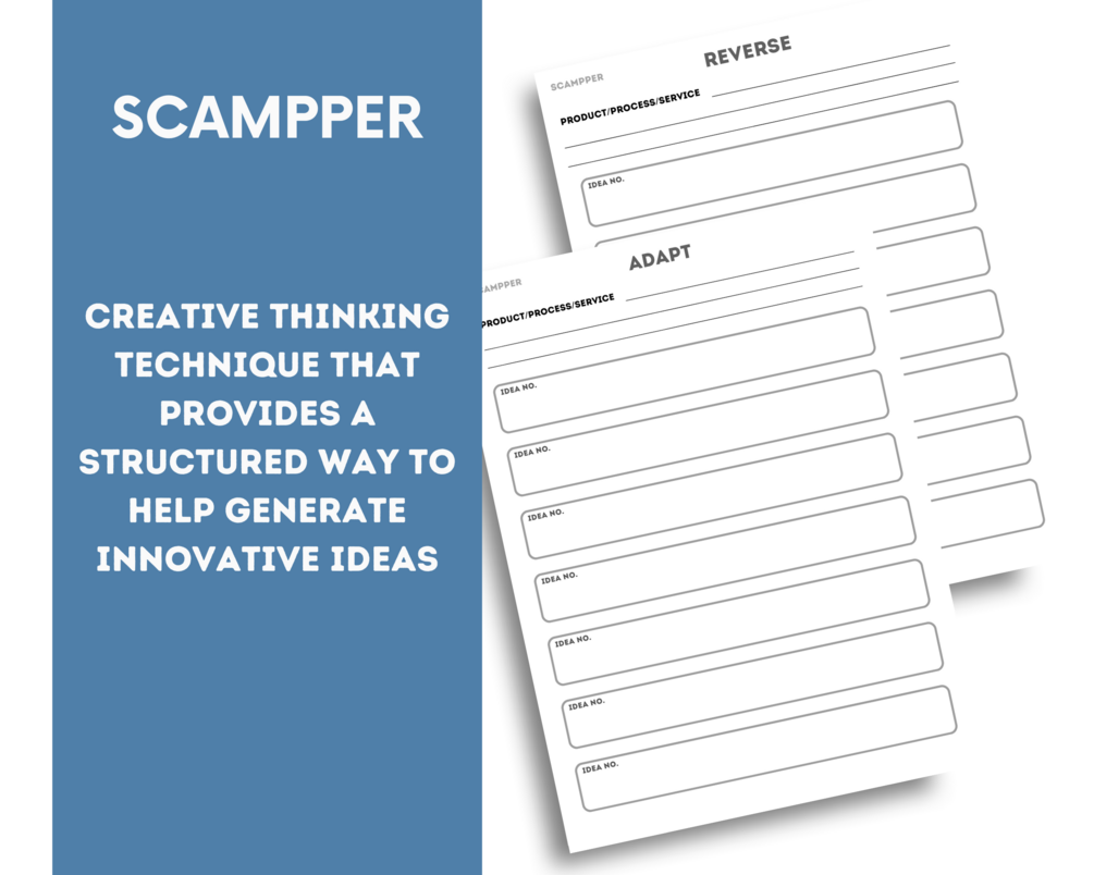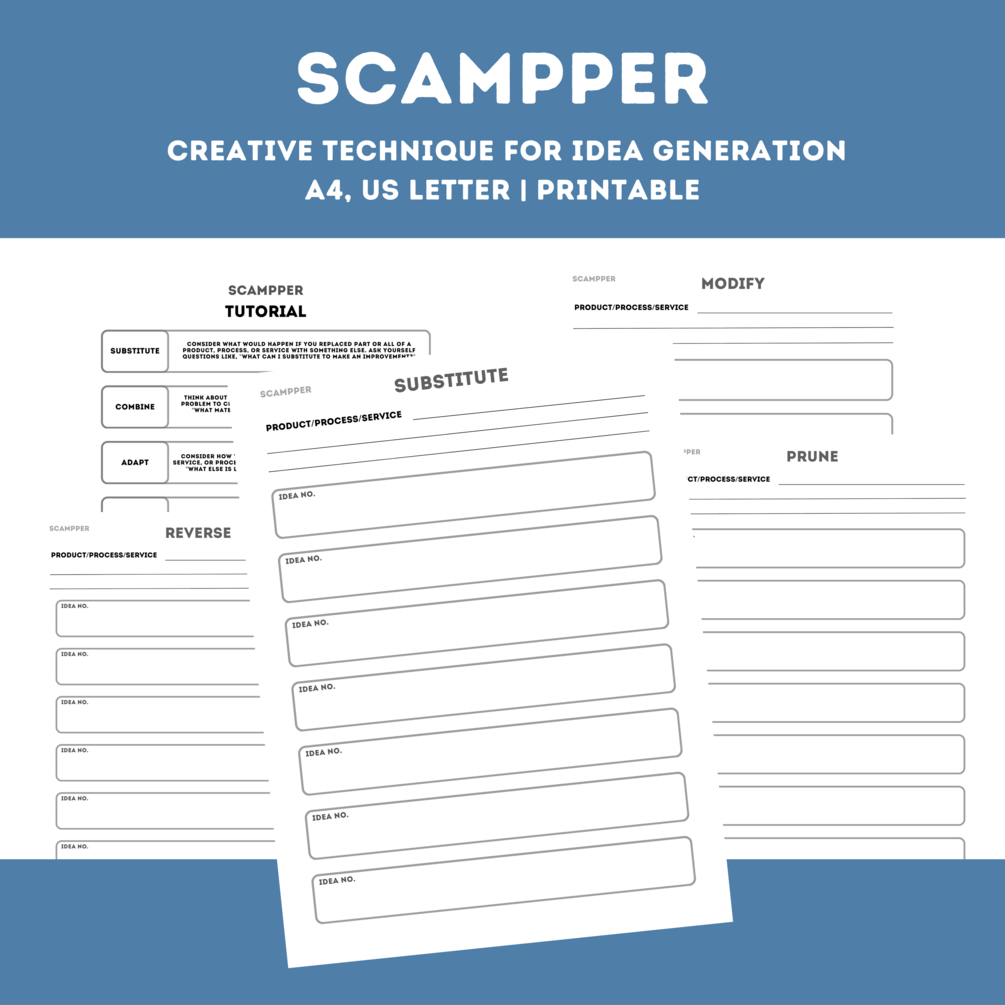 Description: Harness your creativity with this unique printable template designed for implementing the SCAMPPER method. This method is a game-changer for diversifying your creative process by asking questions and igniting your imagination. Apply it to art, design, writing, or business projects!