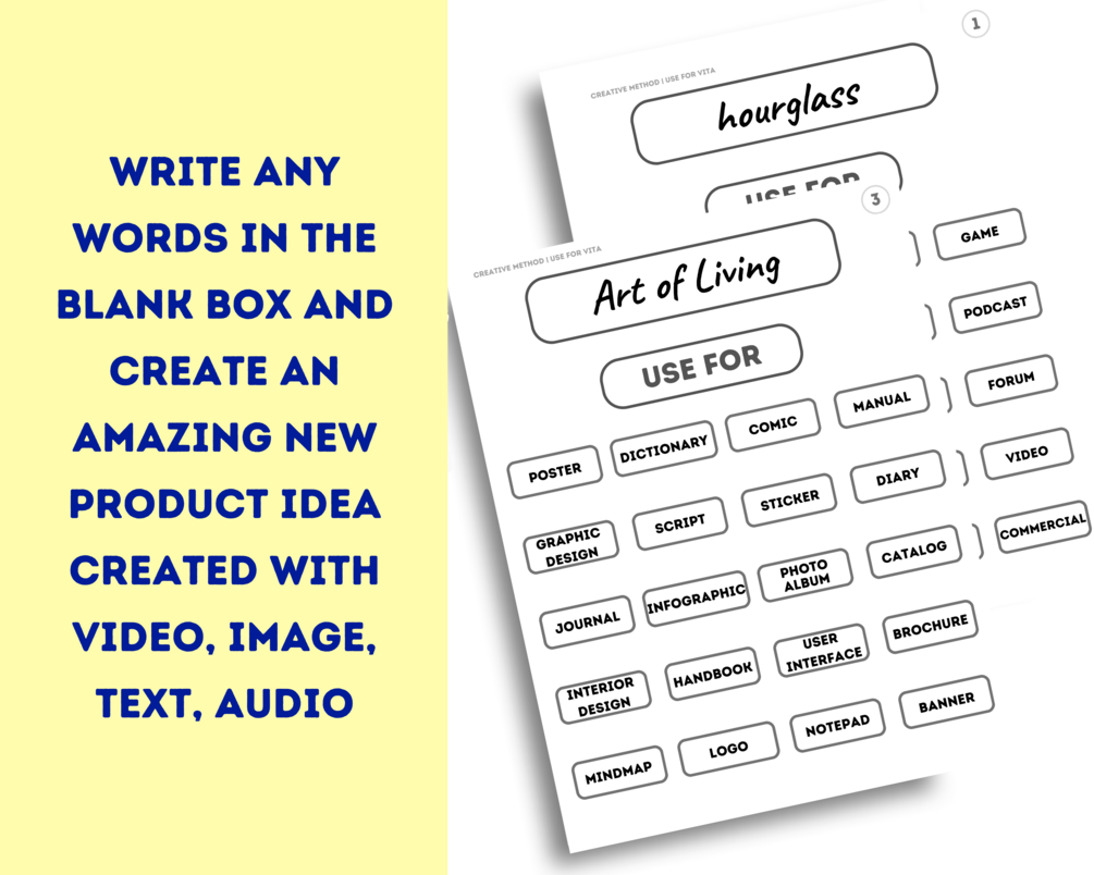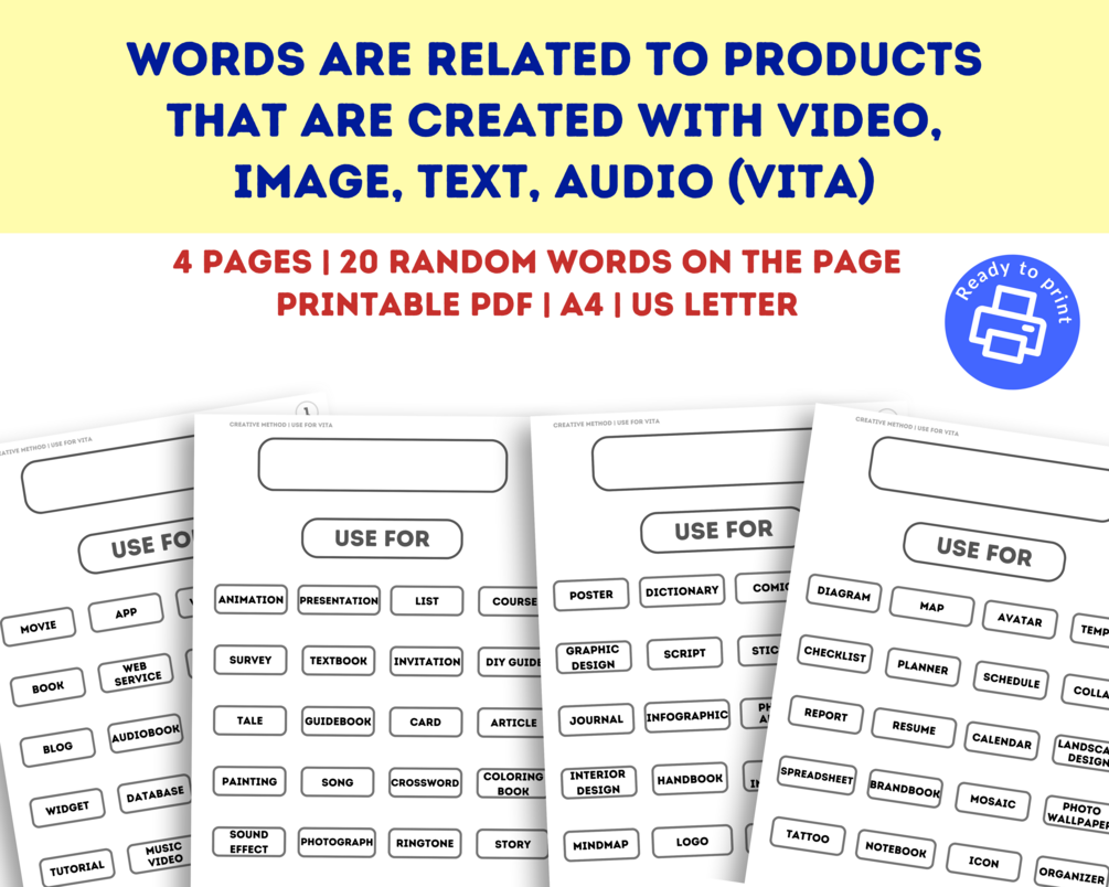 This creative method collects 80 random words that are associated with products created with video, image, text, audio. This is not a complete collection. Therefore, a blank template is attached in which you can write any other words.